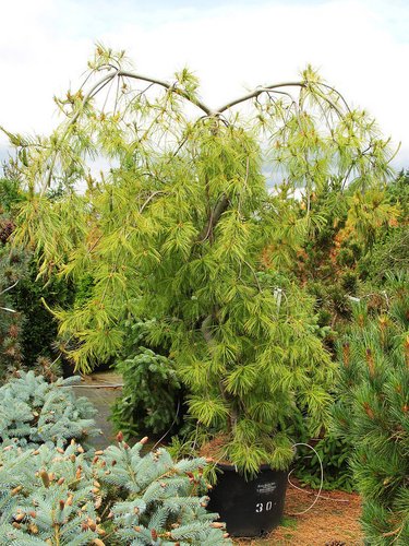 A selected form of the Eastern white pine with all pendulous branches undulating as they cascade downward. Beautiful blue-green, long needles are soft to the touch. A semi-dwarf conifer with long hanging branches that can touch the ground. Long, blue-green needles cascade gently from swooping, pendulous branches on this popular, robust specimen of Eastern White Pine. If staked, its form can be tall, slender and distinctly weeping, or it can drape and dangle along the ground if left to its own devices. Smooth, gray bark gives the pine an elegant, formal look.